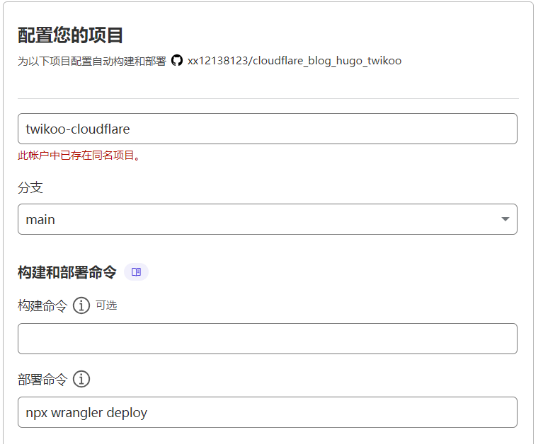 提交后,在Cloudflare新建Pages,选择twikoo-proxy仓库,然后直接部署,即可在自定义域看到twikoo-proxy-xxxxx.pages.dev,该链接为你twikoo的api,直接浏览器访问可查看部署的版本号。